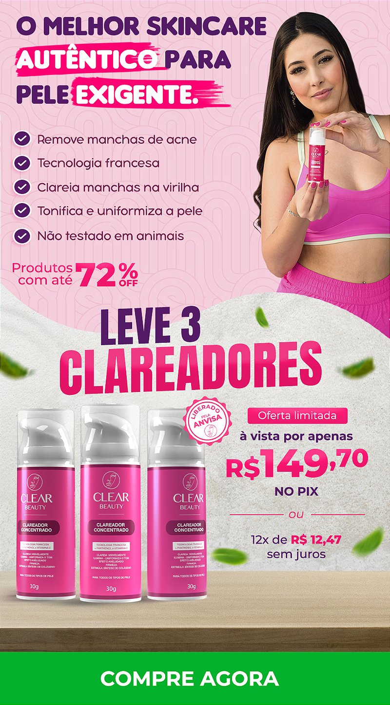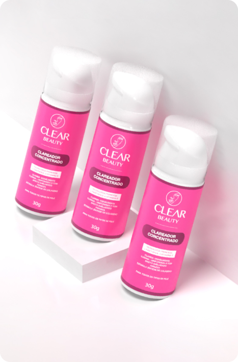 Clear Beauty é um produto revolucionário que ajuda a clarear manchas, melasma, foliculite, espinhas e pode ser usado nas axilas e virilhas. Atua inibindo a produção de melanina, o pigmento que dá cor à nossa pele.